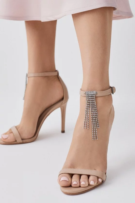Adding a pleasing sense of swish to every step, these colour-pop leather sandals come fringed with opulent crystal tassels cascading from each ankle strap. Slender toe straps and spike stiletto heels enhance the modern, minimal finish, making them the perfect pair for special parties.