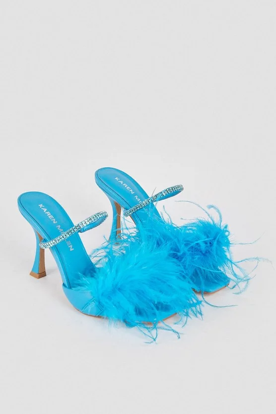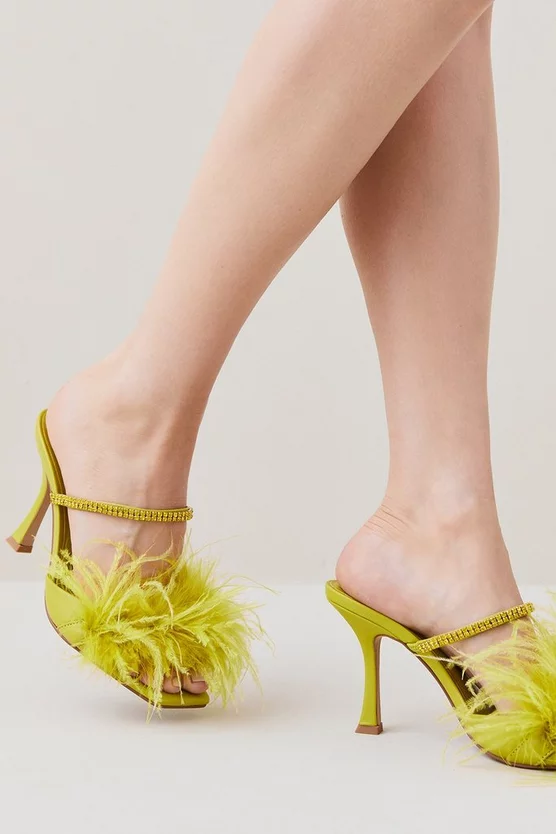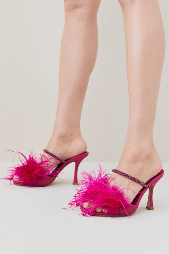 Inject party-ready flair into your ensemble with these feather-trimmed mule heels. The addition of fanciful feathers make these shoes truly worthy of the spotlight, while a diamante-detailed strap add a touch of glamour.