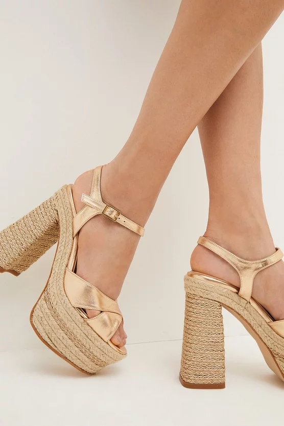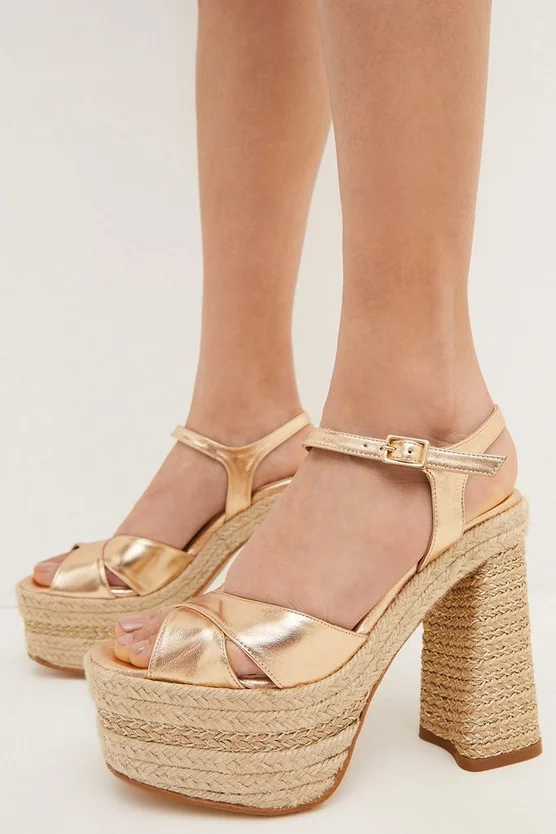 An elegant spring/summer footwear addition, embrace the resurgence of the platform sandal with these espadrille sandals. Featuring a heel height of 11.5cm, the upper is crafted in buttery-soft leather for comfort, whilst the metallic tone adds just the right amount of glamour.