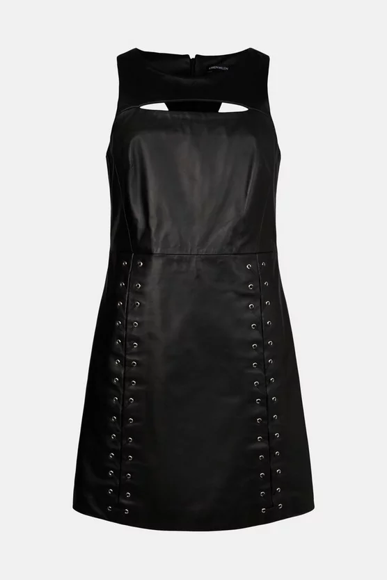 Edgy but elegant, this luxurious leather dress shows off a seductive front cut-out and laced eyelet detailing accenting the skirt. Smart enough for work when layered over a crisp white blouse or roll-neck jumper, its biker-inspired details lend a sharp finish to any occasion.
