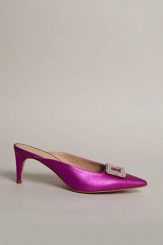 Make very stylish strides in our modern take on mules. Showing off chic kitten heels,, pointed toes and sumptuous metallic leather,, this luxe design is sure to punctuate any look with a polished finish. Square-buckled crystal brooches add a final dash of drama.