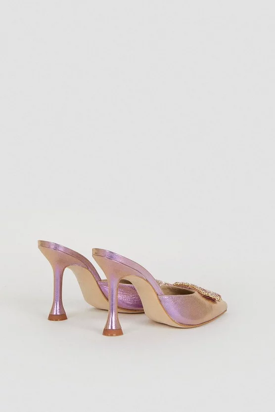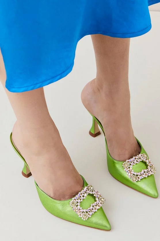 Made to shine, these metallic leather shoes possess an opalescent lustre. Gemstone embellishments add a regal essence, giving this pair an elevated, premium feel.