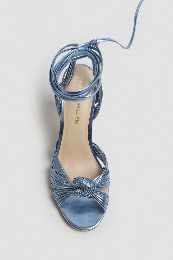 A truly show-stopping party heel, this metallic leather sandal showcases leg-circling tie straps for maximum impact. From our coveted premium range, this disco-ready pair makes its mark courtesy of knotted straps and slender mid-height heels that were made for dancing in.