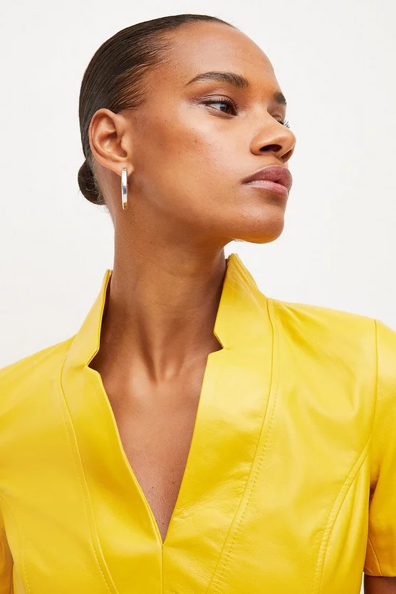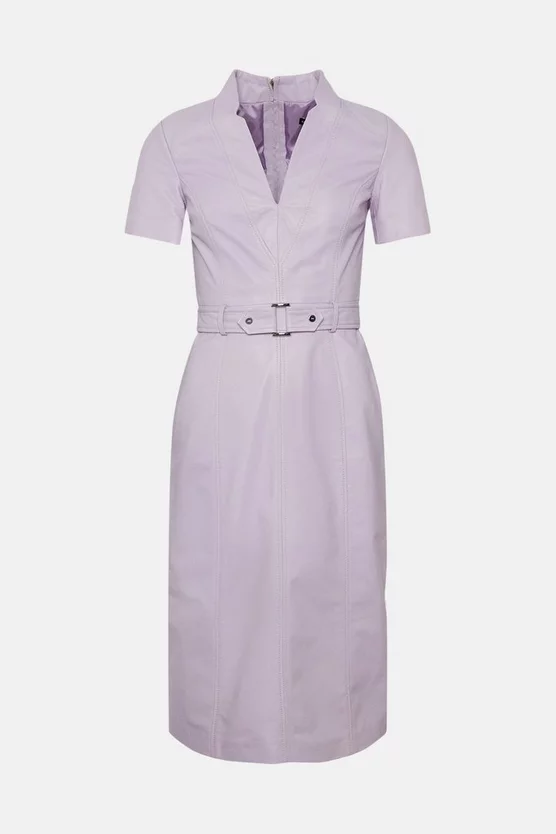 In a soft pastel hue, this luxurious leather dress feels oh-so-right for summer. Crafted in a perennially flattering pencil shape complete with short sleeves and a unique notched neckline, it promises to accentuate your figure beautifully. It is finished with a topstitched buckled belt to cinch in the waistline, adding elegant edge to a truly covetable new-season piece.