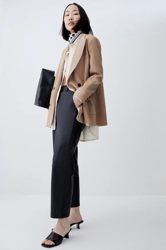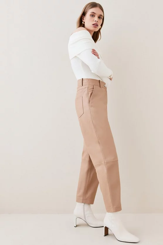 Our signature leather is sculpted with cosmopolitan elegance for these tailored trousers. Boasting a classic straight leg silhouette, they have a high-rise waist thatโs punctuated with belt loops, side and back pockets, and a button and zip fly. Landing at an ankle length, pair this piece with simple stilettos or a colour block mule for an elevated effect.