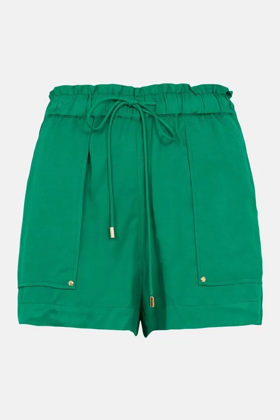 Master chilled summer nights with these versatile shorts. Crafted in breezy linen-blend fabric, this pair is tailored with a flared leg and ribbed waist for optimal comfort. Handy pockets and luxe gold tipped drawstrings also make them just the thing for impromptu plans.