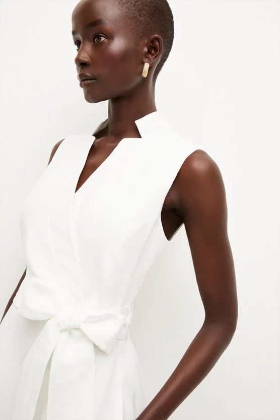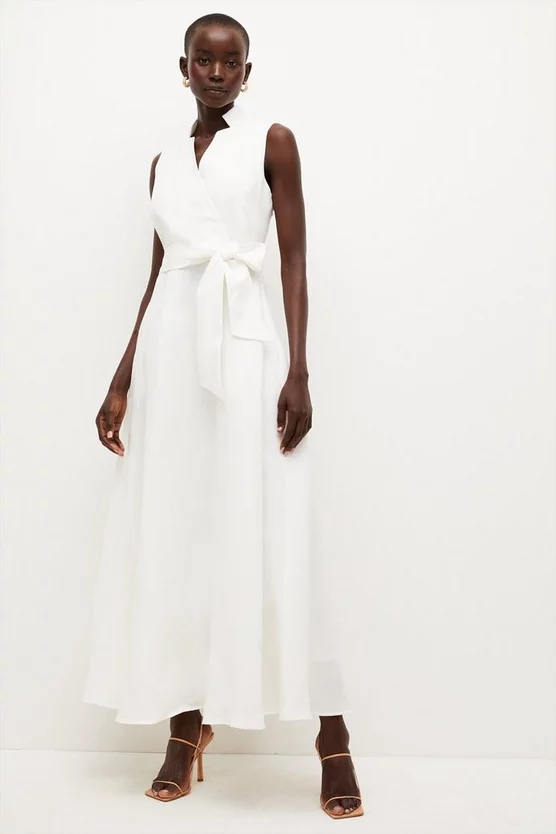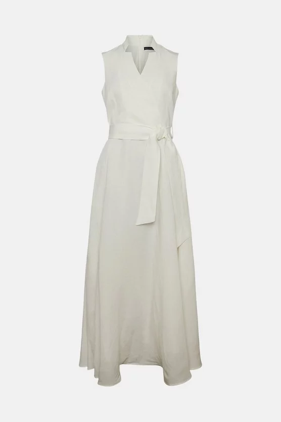 Envelop your figure with this dress. An ode to the female form, the piece beautifully wraps over the bust and accentuates your dรฉcolletage with a low, notched neckline. Oversized bow detail at the waist draws the eye in, while the flared skirt will move just as beautifully as you. An ankle-skimming midmaxi length offers an on-trend touch and allows a glimpse of your favourite summer sandals.