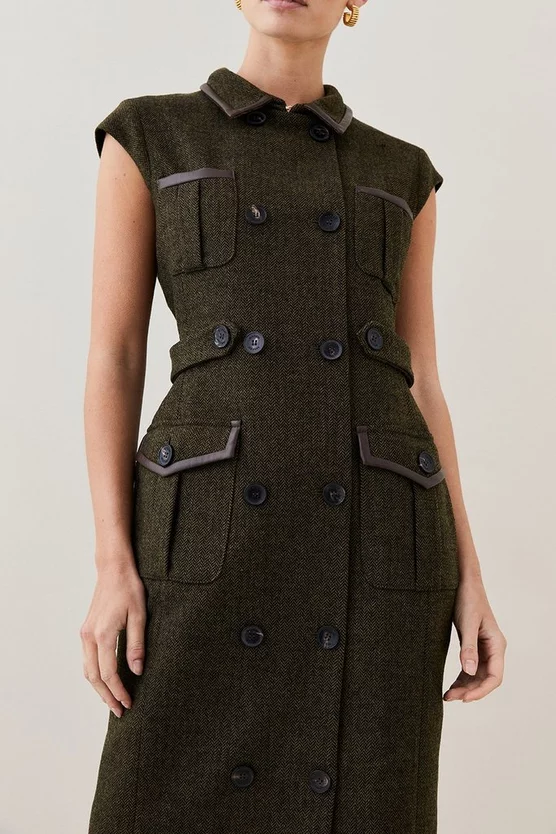 Main: 69% Virgin Wool, 30% Polyester, 1% Elastane. Excluding trims: Lining: 100% Polyester. Dry clean only. Do not wash. Do not tumble dry. Dry iron cool. Model wears UK 8/US 4