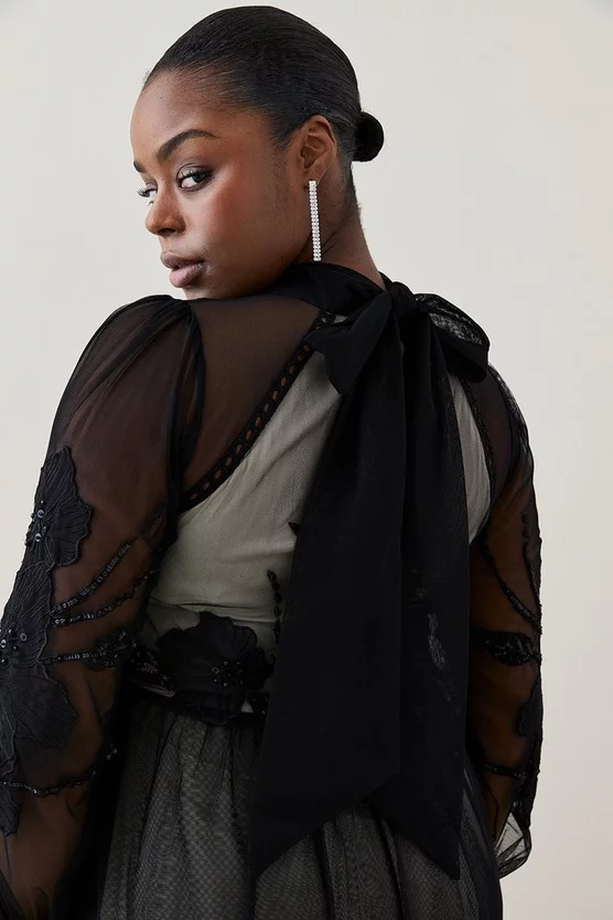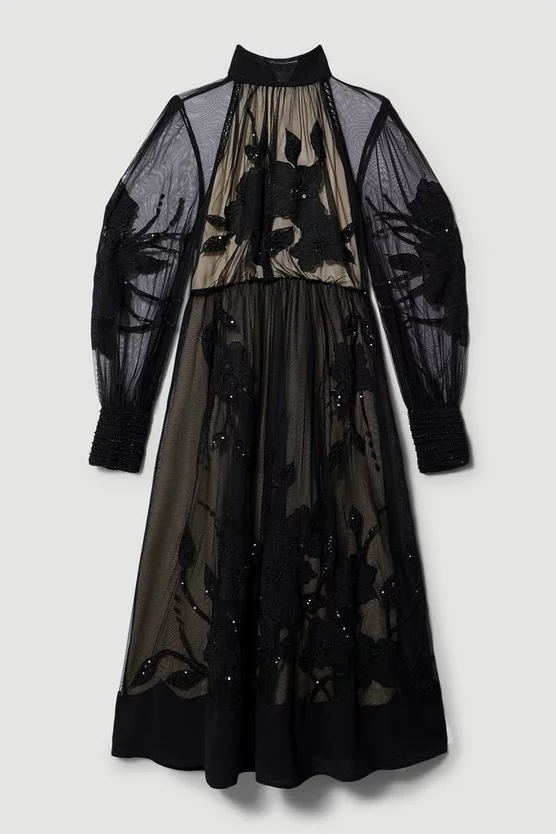 Coupon 👏 Karen Millen Lydia Millen Plus Floral Applique Mesh Woven Midi 👗 Dress – black 🎁