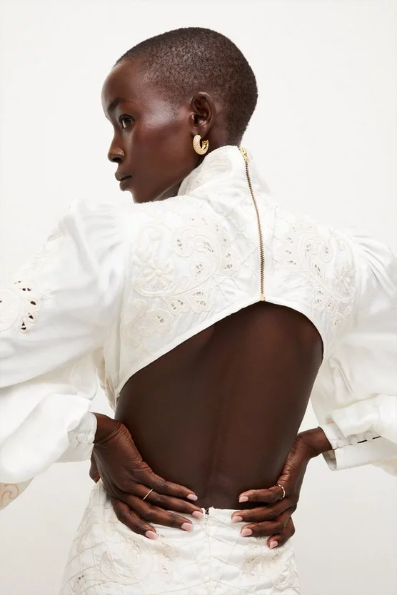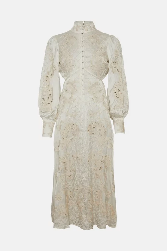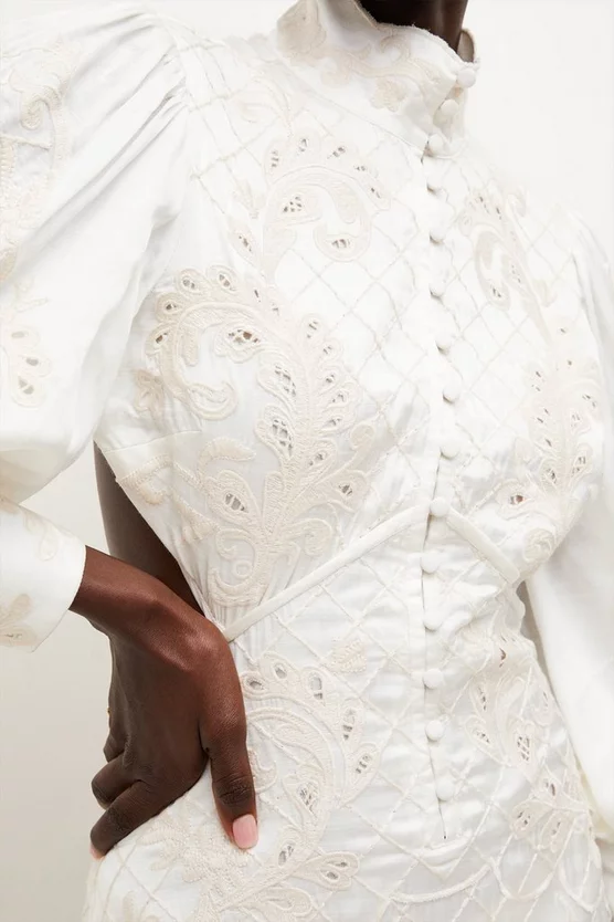 A luxe yet fluid design, this dress will seamlessly fit into your new-season wardrobe. Designed with mirrored cutwork fabric, the piece offers an elevated take on the classic white dress. The intricate cutwork details offer textural allure, whilst a high-neck bodice, buttoned front and Victoriana-inspired billowing sleeves master daytime elegance.
