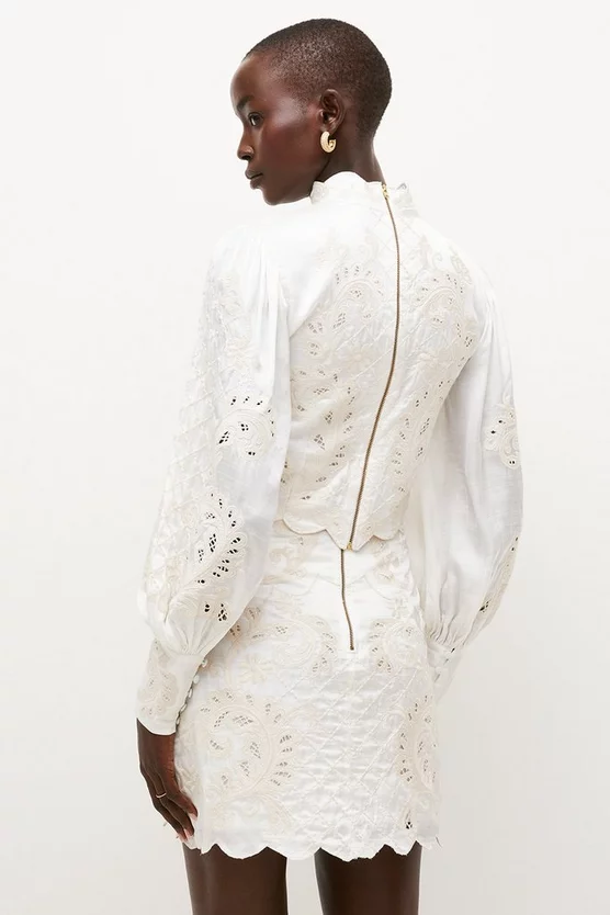 An opulent, and whimsical, take on the mini skirt, this intricate design boasts textured cutwork and ladylike scalloped trims. Sitting high on the waist to accentuate your figure, it lends an undeniable air of romance to special summer occasions.