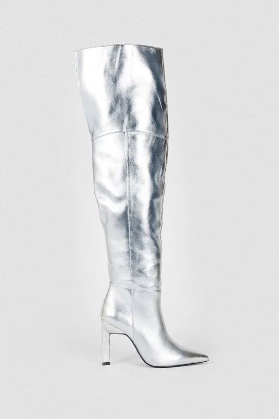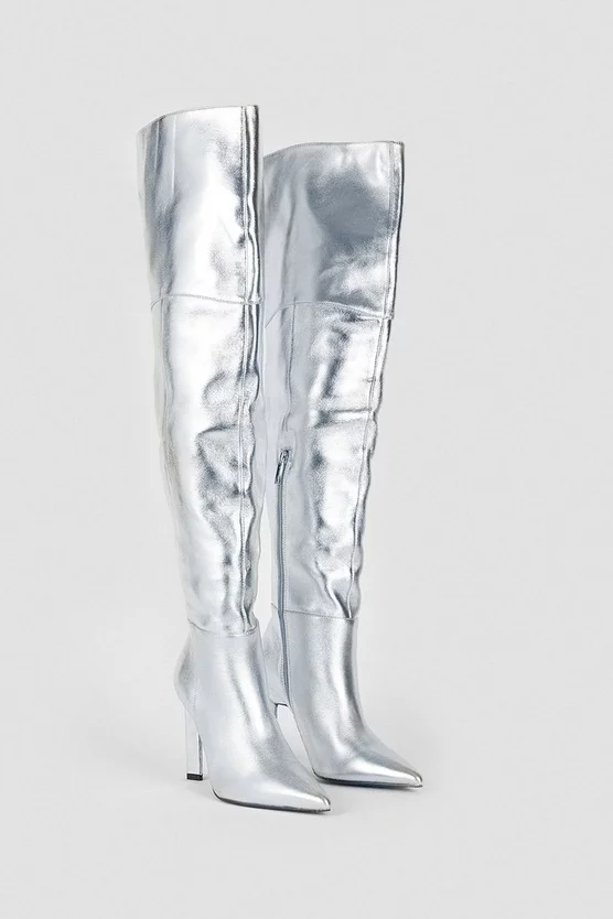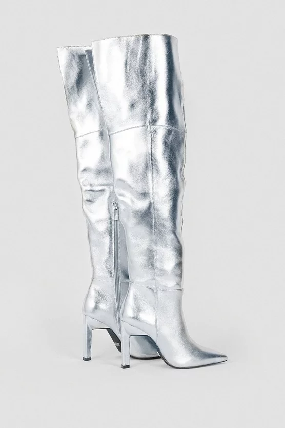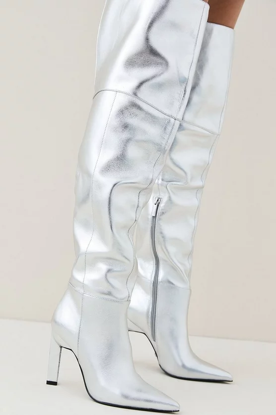 Imbued with a futuristic appeal, these knee-high boots are crafted from leather for a timeless finish. Pair this scintillating design with shimmering paillettes for an after-dark affair.