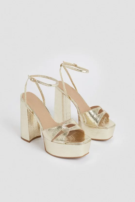 Take summer party looks to bold new heights with these go-getting platform sandals. Crafted from luxe Spanish leather, their textured metallic finish and chunky soles nod to the decadence of the disco era. Finished with slender ankle straps and unique cut-outs, this open-toed pair were made to dance all night long in.