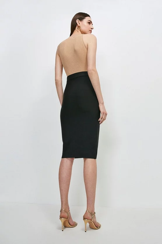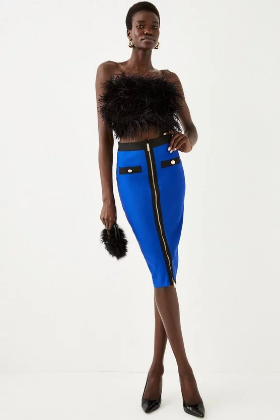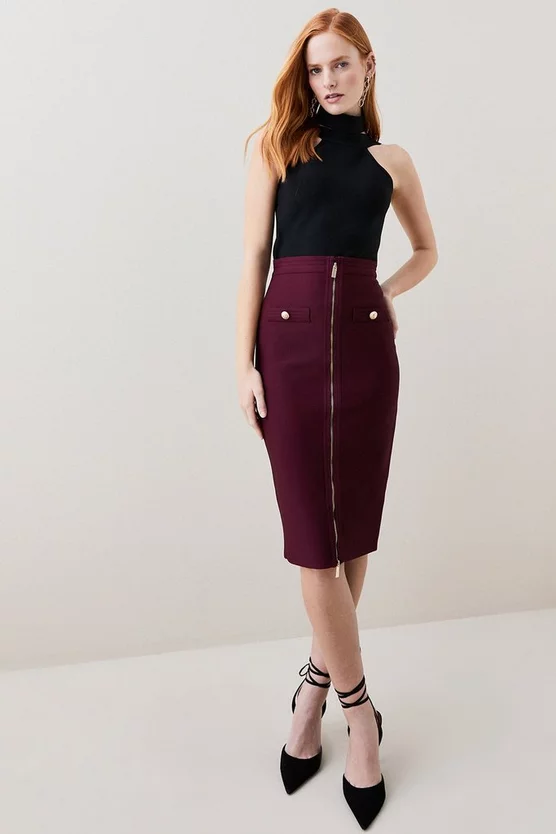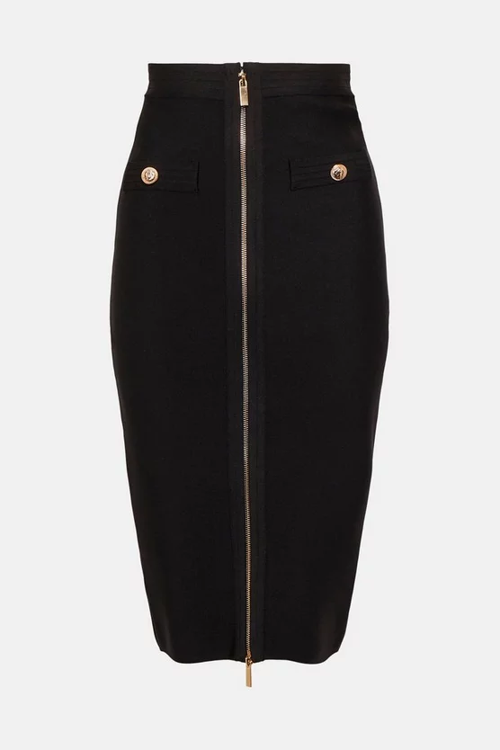 Beautifully moulded to each contour of your frame, this pencil skirt is the key to instant confidence. Hugging you in all the right places thanks to its special bandage knit fabric, the piece is luxuriously detailed with a glossy front zipper, military-inspired buttons and textured trims.