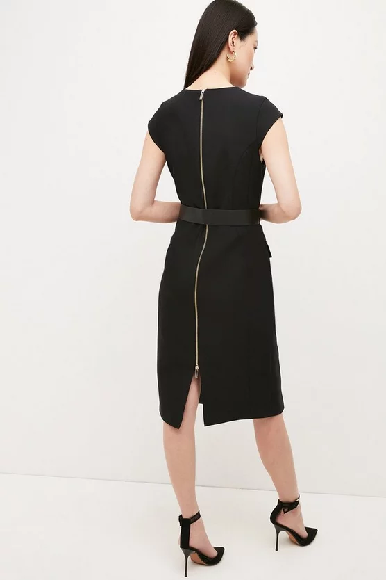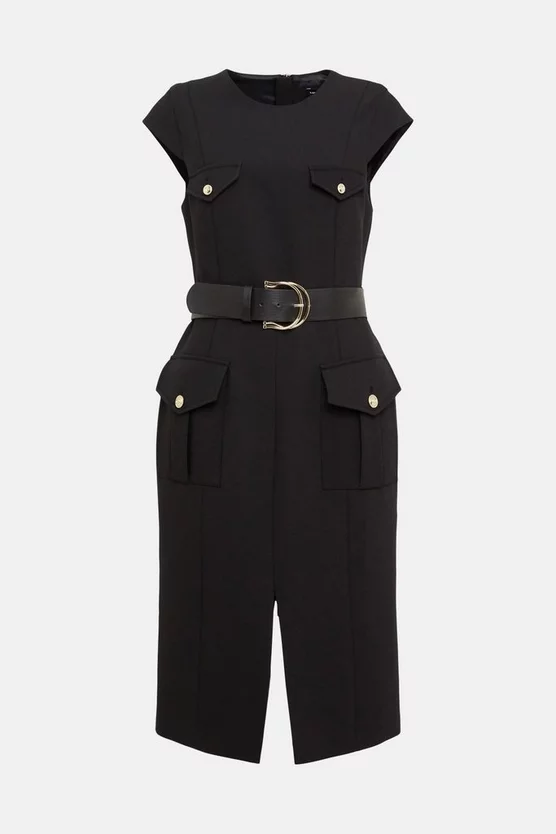 Subtly showing off curves with its pencil silhouette and waist-defining belt, this military-style dress was made for those desk-to-dinner days. It features understated details like buttoned slip-style pockets and a sharply cut hem split to refine the otherwise classic silhouette.