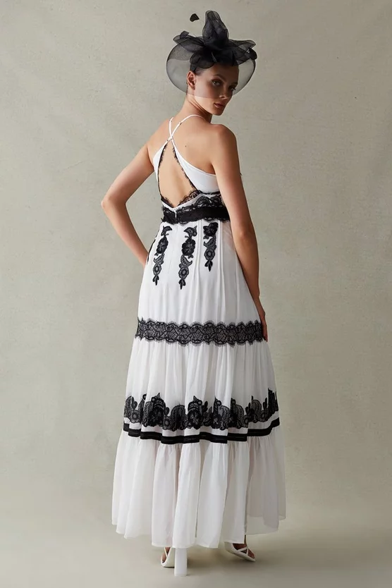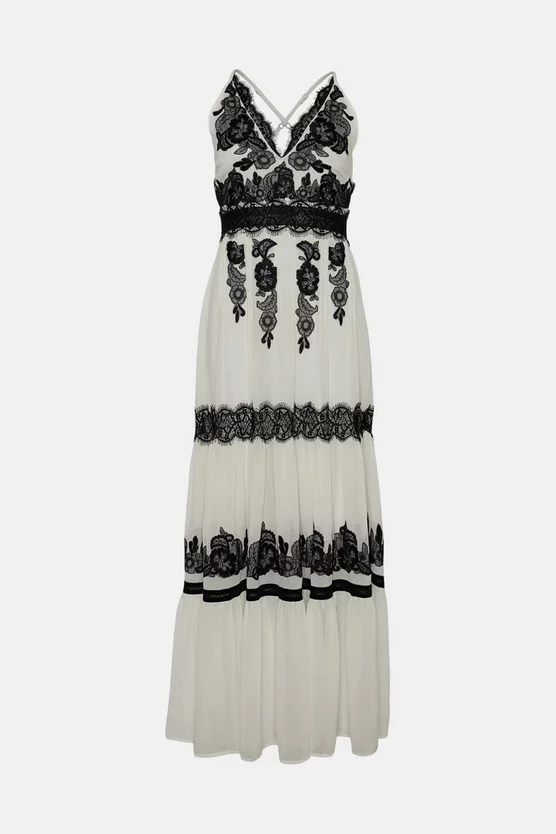 Feel the breeze. This airy maxi dress marries lace panels with embroidered detailing for an ultra-feminine combination. Halter-neck straps that cross over at the back effortlessly frame the shoulders, anchoring a long, languid silhouette that sweeps down to the floor.