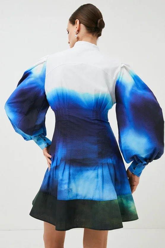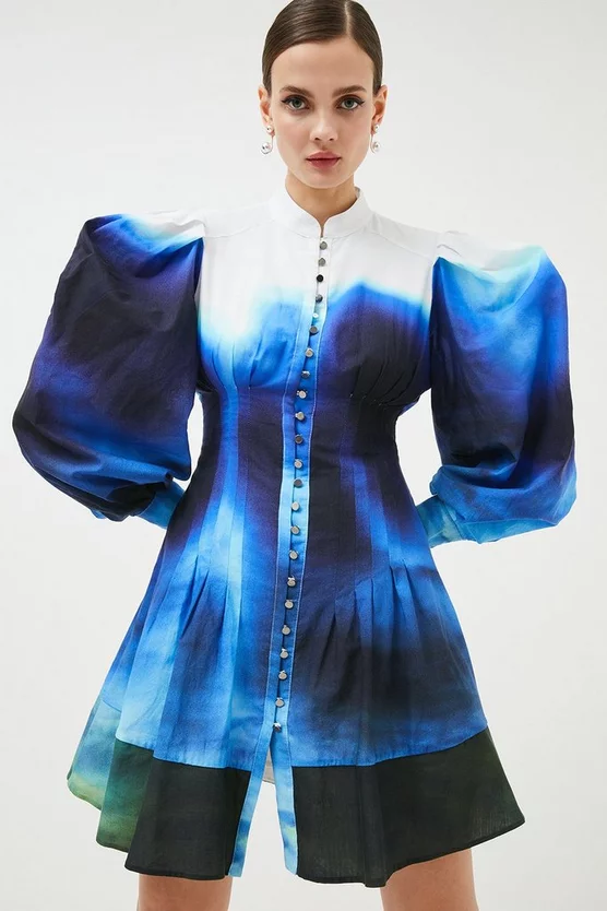 Make an instant impact in this statement shirt dress. In a contemporary Victoriana style, the placed scenic skyline print brings a dramatic flair to the design. The puff sleeves and A-line skirt are contrasted by the cinched corset waist to flatteringly exaggerate the frame, completed with branded gunmetal buttons along the front. Sitting above the knee, complete with ankle boots for a powerful finish.