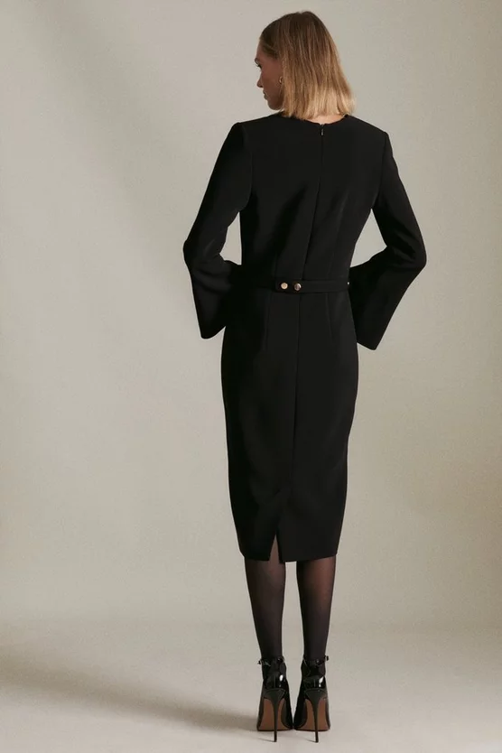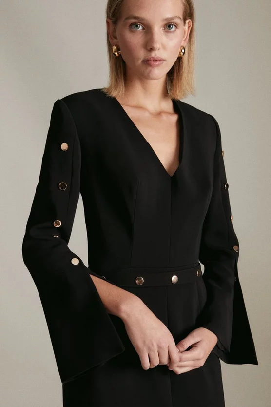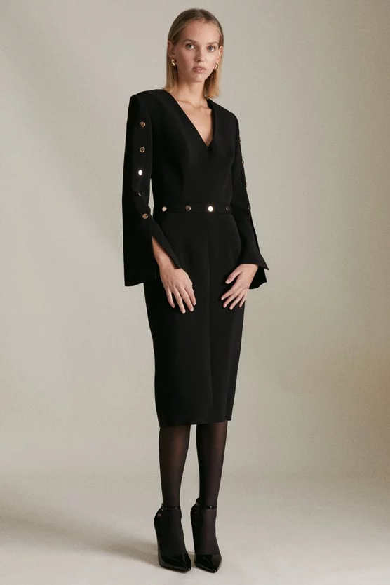 This dress makes a case for statement sleeves. Featuring split flared cuffs that’ll move beautifully with you, the piece is peppered with glossy studs at the arms and waist for an ultra-glam touch. Designed in our signature compact stretch fabric that’s luxurious and soft to the touch, it has a four-way stretch so it’ll always fit you like a glove.