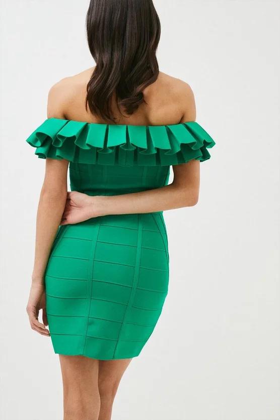 Be the talk of the party in this show-stopping bandage dress. Cut from finely knit panels that sculpt curves to perfection, it makes a bold and flattering choice and features a look-at-me layer of frills bordering the flirty Bardot neckline.