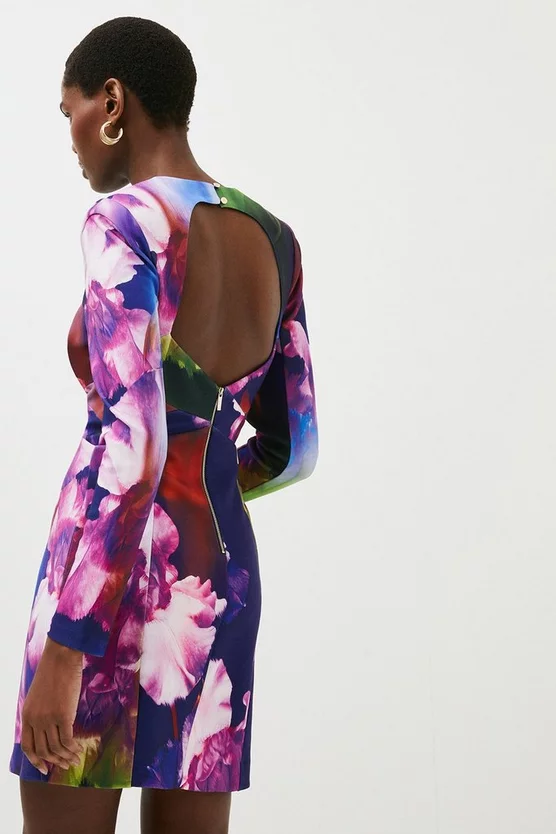 Blending a graphic floral print with a sultry silhouette, this flattering woven mini dress is sure to turn heads this season. Showcasing a flirty open back and sporty zip closure, it stands out for all the right reasons.