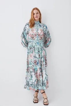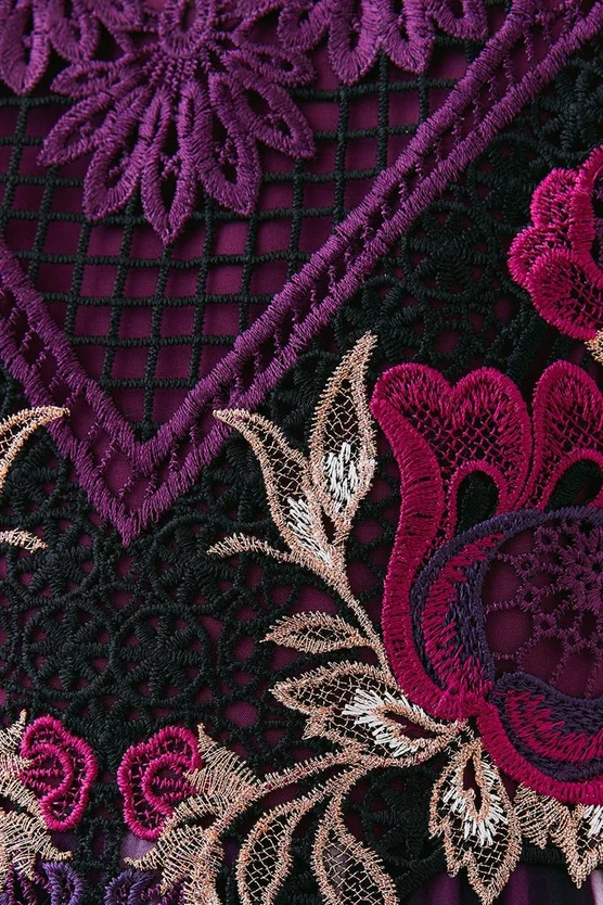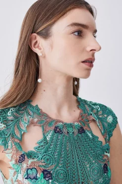 Painting a picture of elegant romanticism, this mesmerising dress drapes elegantly down the silhouette in an array of soft pleats. Crafted from luxurious Guipure lace and showcasing a signature in-house floral design, this dress makes a sophisticated choice for both day and night soirees.
