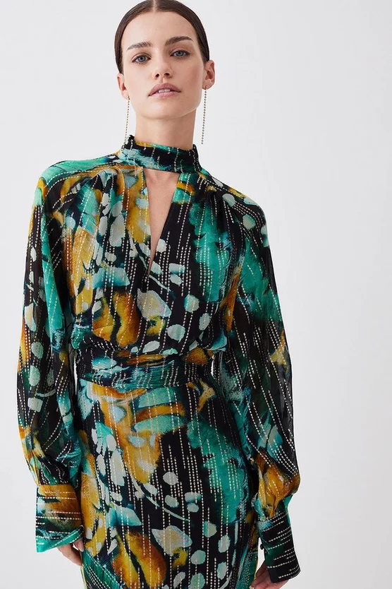 94% Viscose, 6% Metallised Fibre. Lining 100% Polyester. Gentle machine wash at 30 with similar colours. Model Height 5”10 – Model wears a UK 8/US Size 6. Centre back length 130cm.