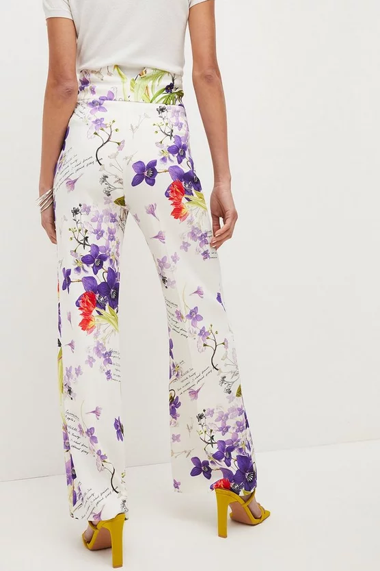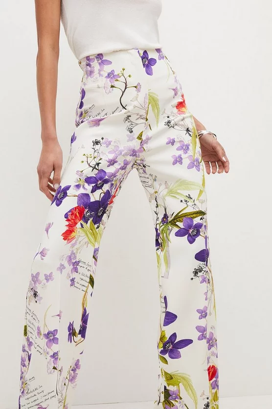 Encapsulating the floral freshness of spring, these statement Compact Viscose trousers come scattered with hand-drawn violets and tulips along with notes from a botanical sketchbook. Created in collaboration with floral artist Rui Jiang, they showcase an exceptional eye for detail fused with a high-fashion (and ultra-flattering) silhouette. The high, notched waistline draws the eye to the narrowest part of your figure, whilst wide-leg, flowing trousers skim the floor for a dramatic finish.