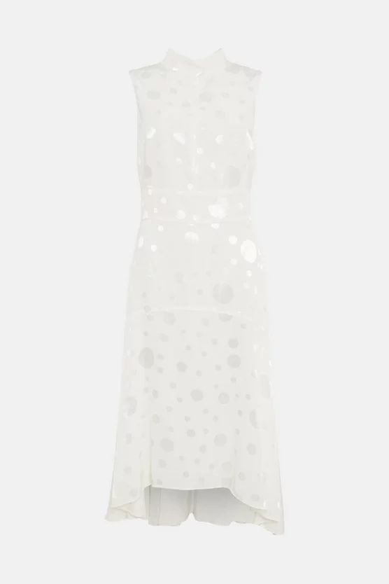 Romantic tonal spots lend a feminine feel to this soft jacquard midi dress. Tailored to an unusual high-low fit complete with asymmetric hem and high neckline, this sleeveless style is just the thing for balmy garden get-togethers and other summer parties.