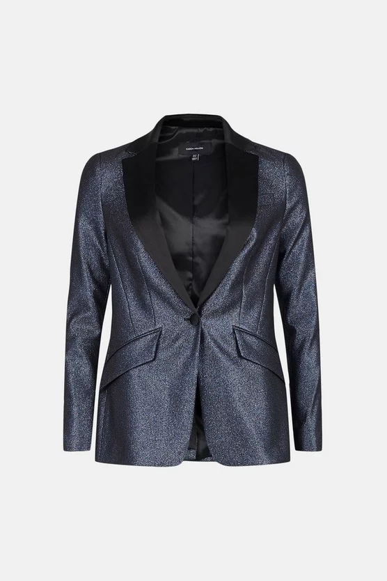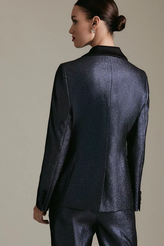 A bold new take on the tuxedo jacket, this gleaming metallic design showcases comfortable stretch jacquard fabric and a sharply tailored fit. Defined by contrast labels and flap pockets, it buttons neatly with a single closure and offers endless after-dark allure. Add slicked-back hair and red lipstick for dramatic dress codes.