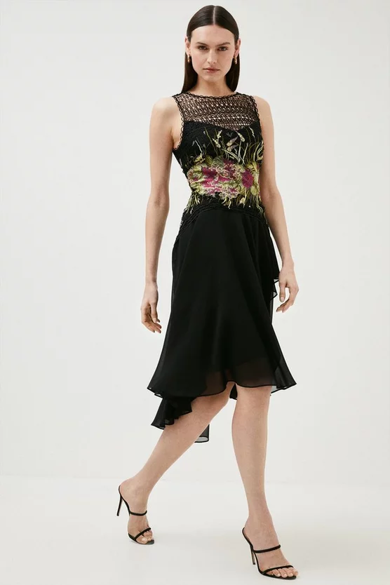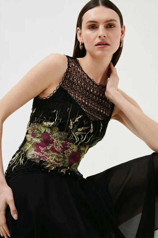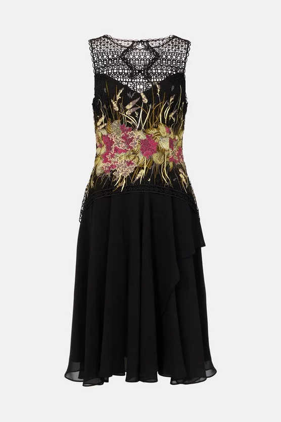 Spring soirees and balmy get-togethers are crying out for this pretty dress. Detailed with delicate guipure lace panels and a unique placement print, it heralds a new take on floral patterns. A swishy midi skirt and sleeveless fit add a romantic sensibility thatโs perfect for warmer weather.