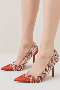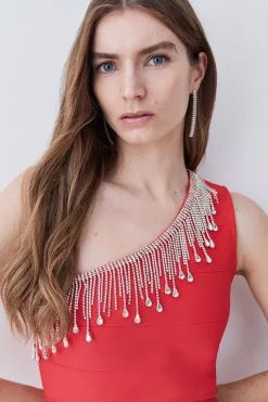 Outlet ⭐ Karen Millen Bandage Diamante Trim One Shoulder High Low Midi 👗 Dress – orange 👏
