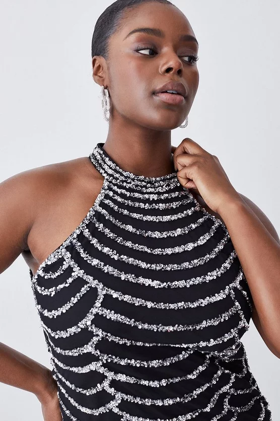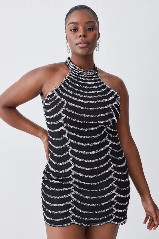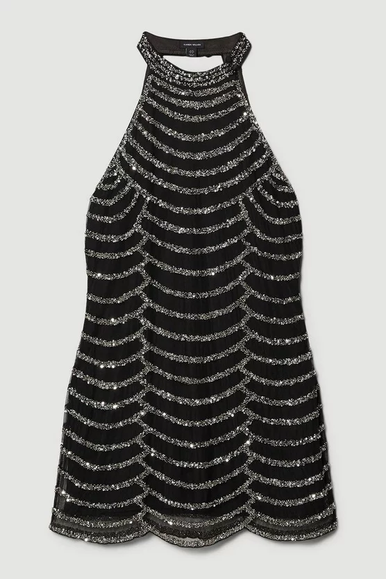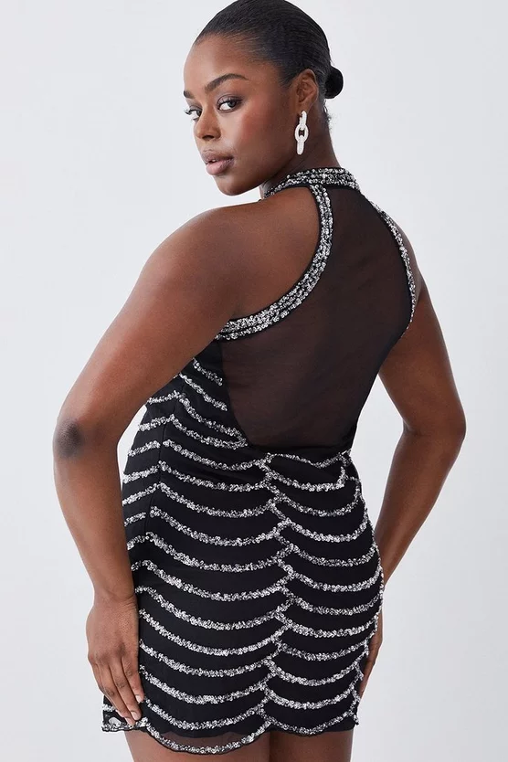 This dazzling mini dress needs no introduction. Intricate sequin details create a flattering draped effect, further elevated by a scalloped hemline. The low back is draped with thin mesh material, adding a touch of elegance. Style this dress with pointed black heels for a magnificent party look.