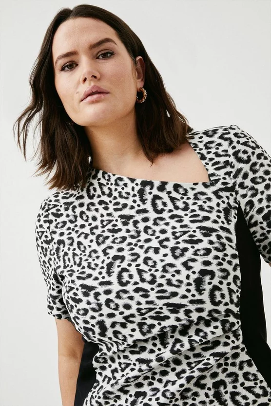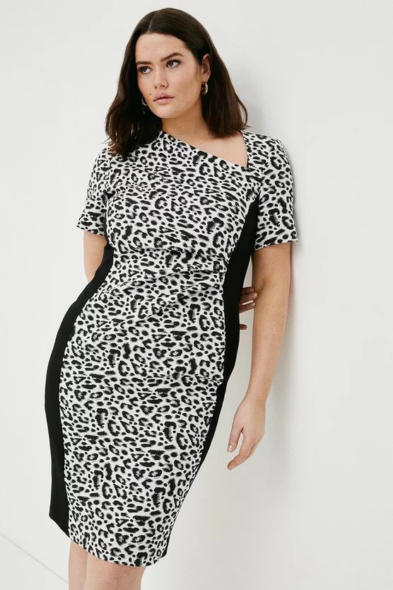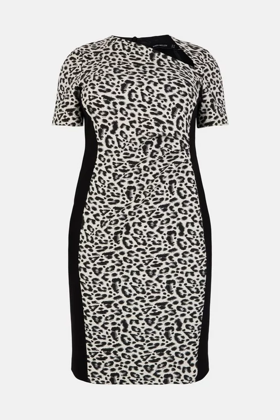 Sultry leopard spots and curve-defining ponte panels define this versatile work-to-weekend dress. Cut with an architectural slashed neckline, short sleeves and a demure midi silhouette, it adds a dash of glamour to any occasion.