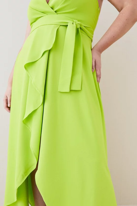 Rippling with romantic dimension, this midi dress cascades with a waterfall silhouette. Defining the waist with a self-tie belt, style this dimensional design with soaring stilettos to elongate the dramatic depth.