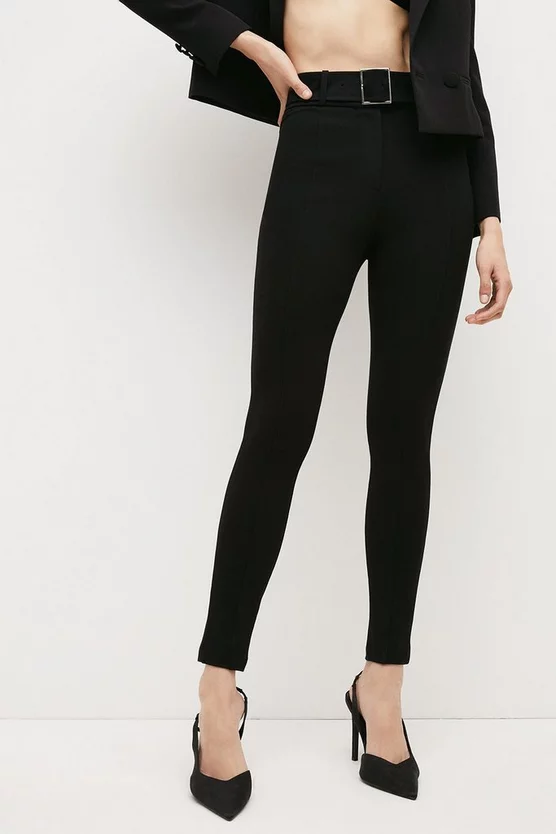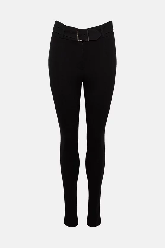 For those on the move these ultra skinny high-waisted trousers are created in a soft and slightly stretch fabric for all day and night comfort. Centre-front seams on each leg emphasise a long silhouette while the self-fabric waist belt finished with a square silver metal buckle defines the waistline.