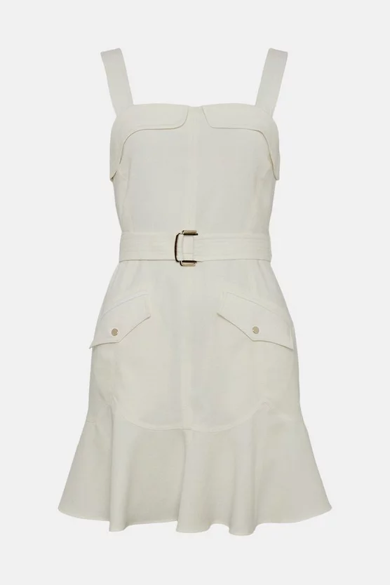 A modern military piece made for snappy dressers, this frilled-hem design features utility-style buttoned pockets and a unique neckline. Cinched in at the waist with a buckled belt, this strappy design marries a sense of sophistication with an easy-going, summery feel.