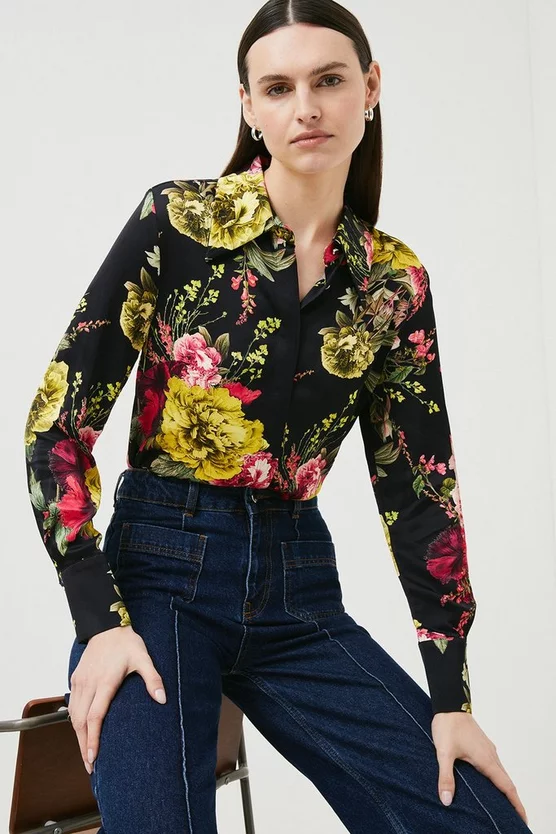 Breathe new life into your shirting selection with this bold floral-print satin style. Featuring 1970s-inspired lapels and neatly buttoned cuffs, it instantly enlivens leather separates or love-worn denim jeans.