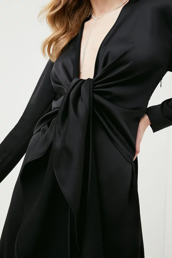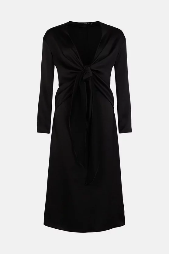 The picture of understated luxury, this silky satin crepe midi dress shows off a plunging neckline that ties elegantly in a knot for a touch of texture. Fitted with simple long sleeves and a rippling midi skirt, it makes a style-savvy investment for those who like to make a subtly elegant impression.