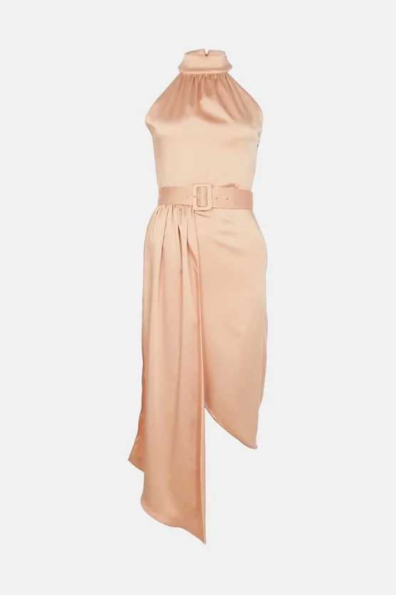 Dial up the drama at extra special occasions in this elegant satin evening dress. Defined by a statement sweep of draped fabric that flows down from the belted waist, it heralds a unique take on opulent after-dark attire. Show a flash of polished skin thanks to its halter neckline and draped, knee-length skirt.