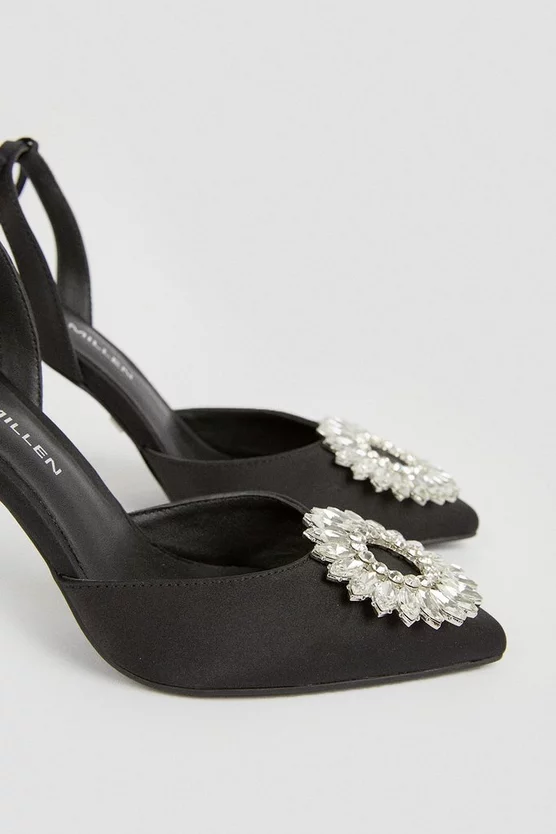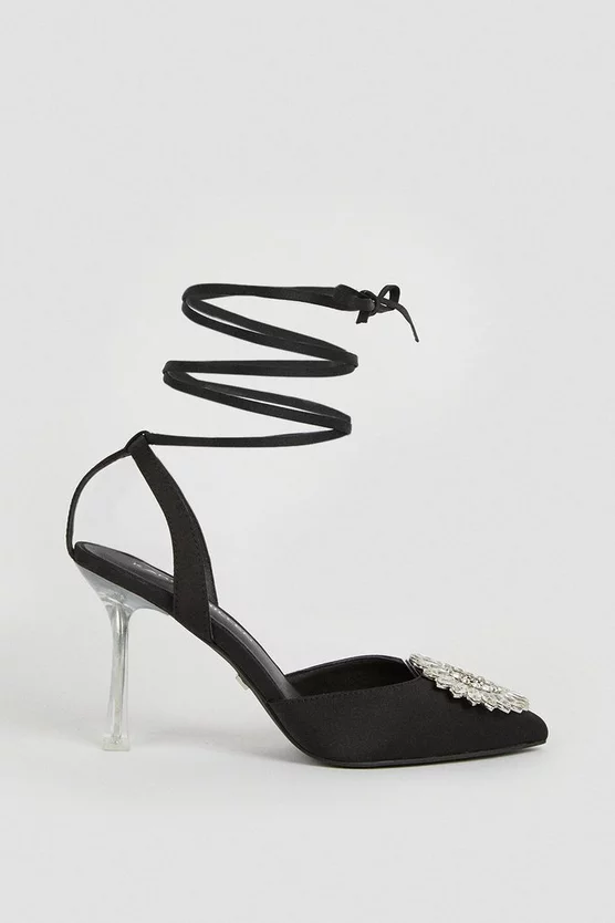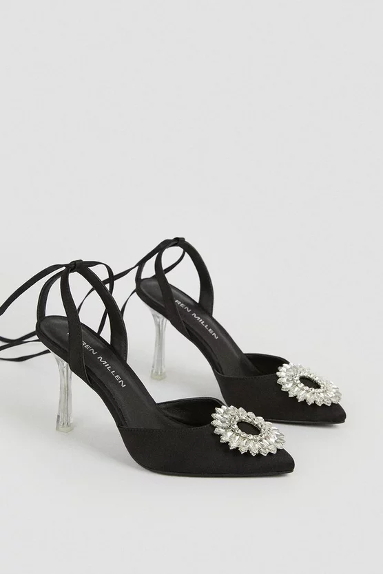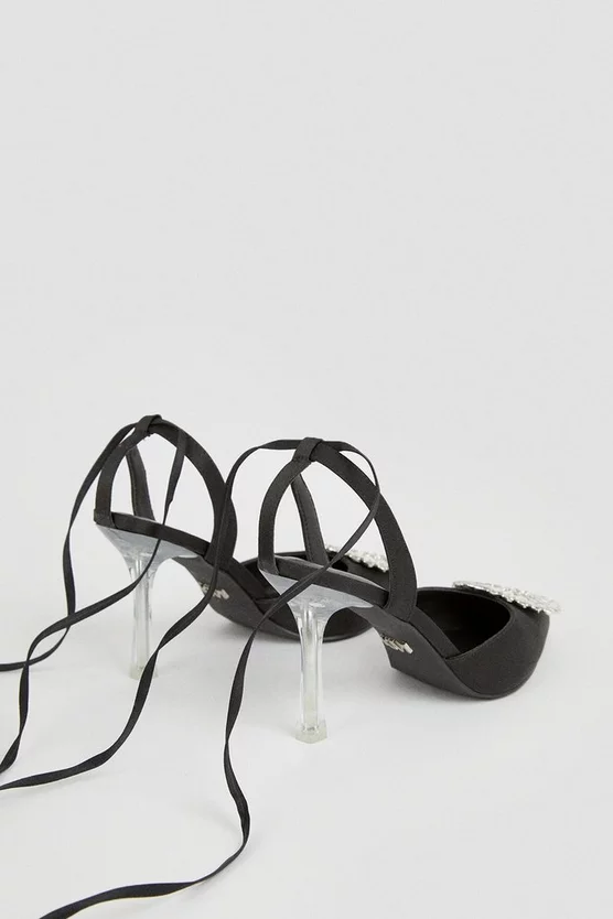 Made for a modern princess, these elegant slingback courts combine light-catching crystal brooches with slender ankle straps and architectural Perspex heels. In a range of timeless hues, they feel just right for joyful summer occasions.