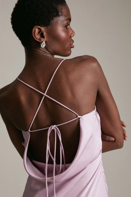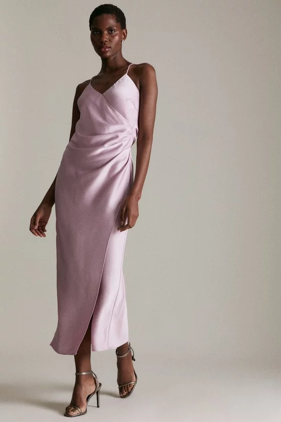 Look the part at special occasions in this lustrous satin midi dress.. With its beautiful soft hue and draped silhouette, it shows off the figure to beautifully flattering effect. Ruched trims, slender tie straps and an ankle-skimming hem bring a modern romantic twist to any event.
