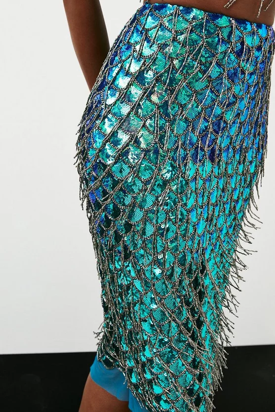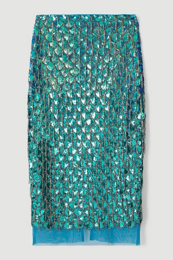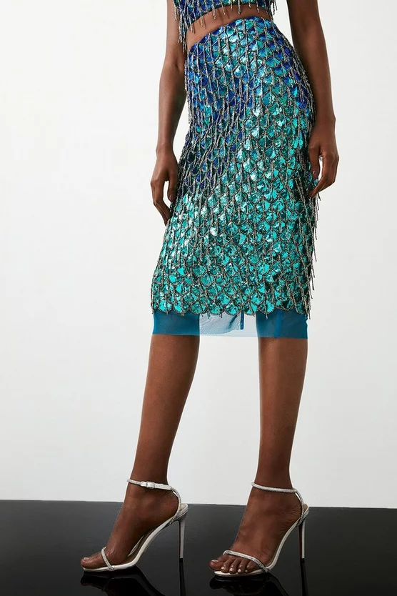 Nodding to the decadence of the Roaring ‘20s with an aquatic-inspired scalloped finish, this midi skirt scintillates with premium modernity. Displaying a dimensional finish with beaded tassels, it sculpts the form with a bespoke fit.