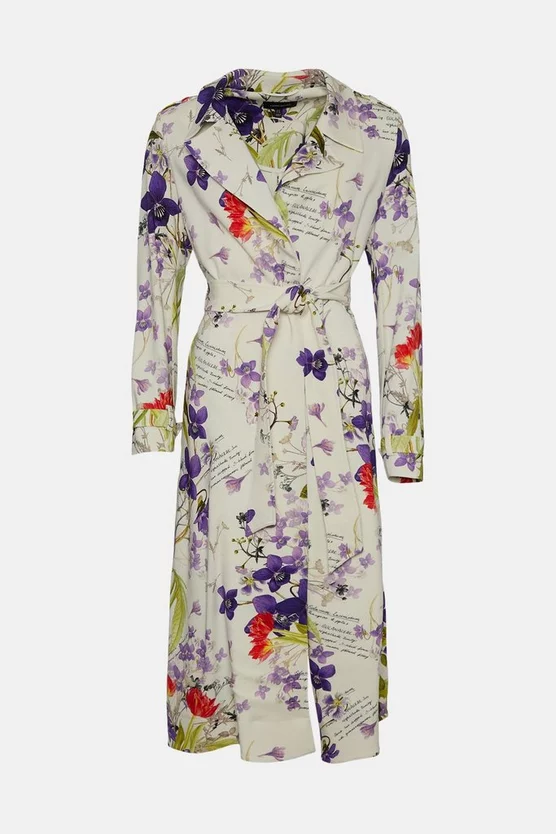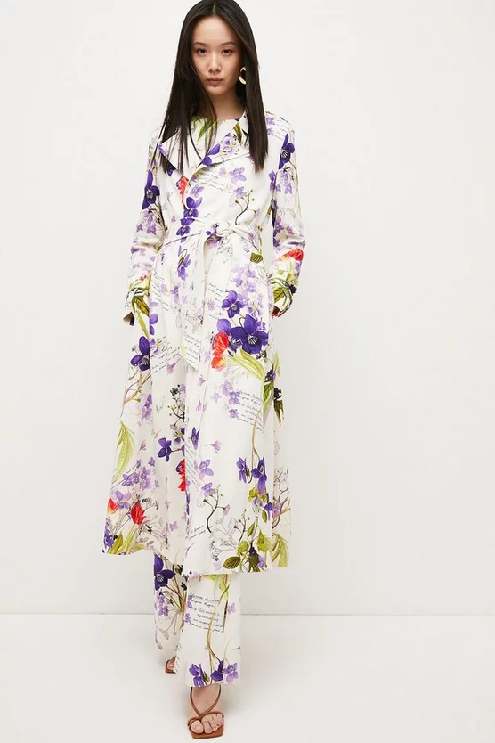 A vibrant take on the classic trench coat, this statement piece comes fresh from our collaboration with botanical artist Rui Jiang. Emboldened with her signature floral blooms rendered in a bright, painterly finish, its draped silhouette, neat tie belt and classic trench details make it the perfect bold cover-up for summer weddings, balmy days in the city and more. Notched lapels, belted cuffs and a back hem split offset the whimsical hand-written passages and vibrant hues to a tee.