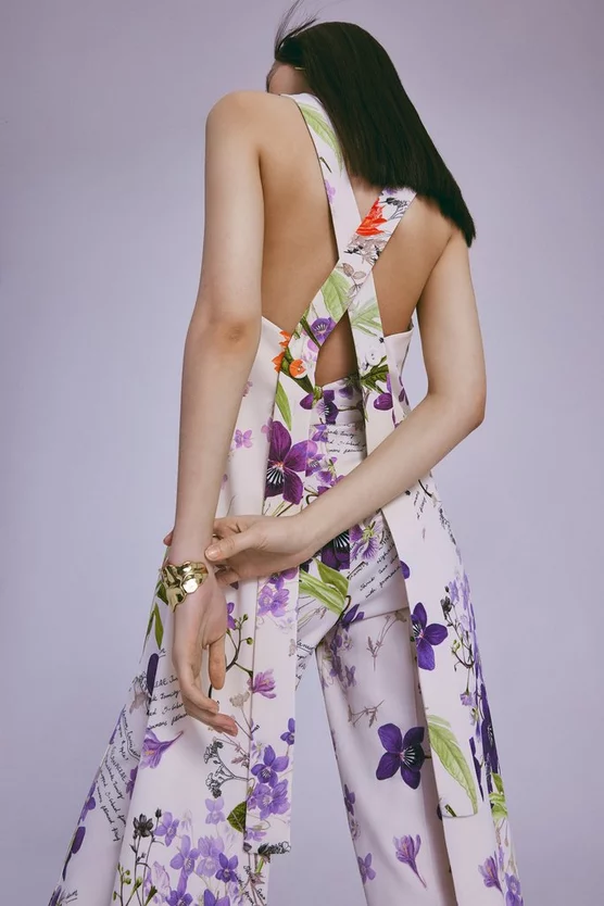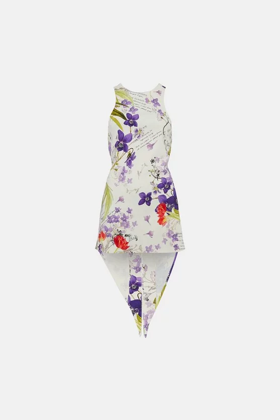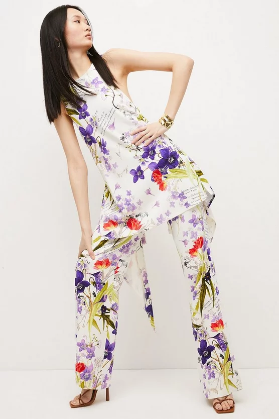 Be a walking work of art in this stunning top from our collaboration with Rui Jiang. Adorned with her signature botanical motifs ? think romantic violets and tulips ? it makes a bold statement with buttoned crossover straps framing the back and a longline, high-low hem. Playing with proportions, our Compact Viscose fabric guarantees a premium finish. Let the languid straps trail nonchalantly behind you as you walk.