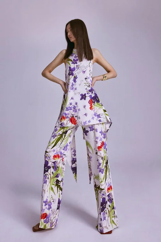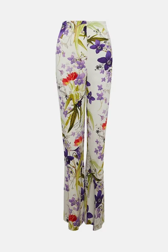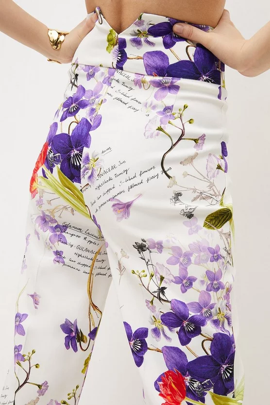 Encapsulating the floral freshness of spring, these statement Compact Viscose trousers come scattered with hand-drawn violets and tulips along with notes from a botanical sketchbook. Created in collaboration with Rui Jiang, they showcase an exceptional eye for detail fused with a high-fashion (and ultra-flattering) silhouette. The high, notched waistline draws the eye to the narrowest part of your figure, whilst wide-leg, flowing trousers skim the floor for a dramatic finish.