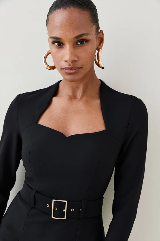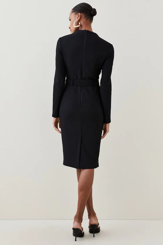 A dress that does it all. Slipping seamlessly from the boardroom to the bar, this scuba-fabric design sculpts the form beautifully. Finished with a buckled belt and unique square neckline, it was designed to enhance feminine figures whilst retaining an air of elegance.