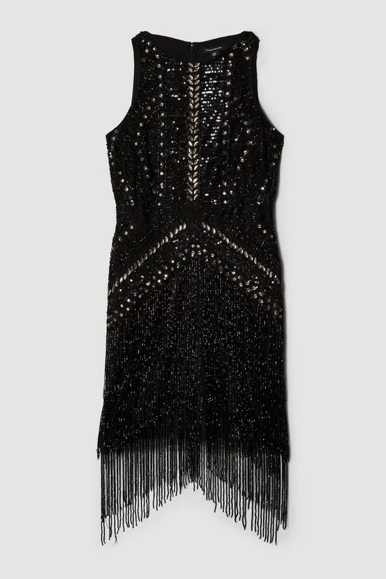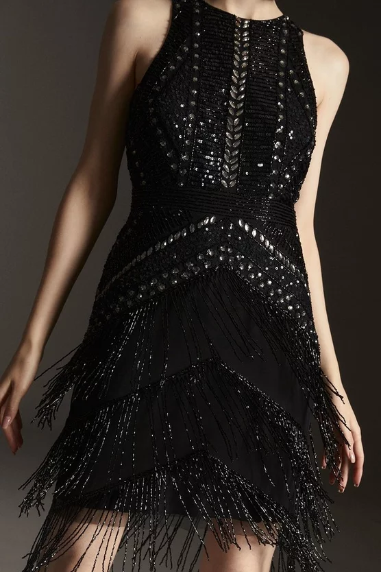 For a taste of Great Gatsby glamour, choose this dress. Detailed with gleaming tassels and opulent lime-green beads, it catches the moonlight beautifully. Our designers have added modern details โ a round neckline, sleeveless fit and mini hemline โ to anchor the glamorous, party-ready silhouette.