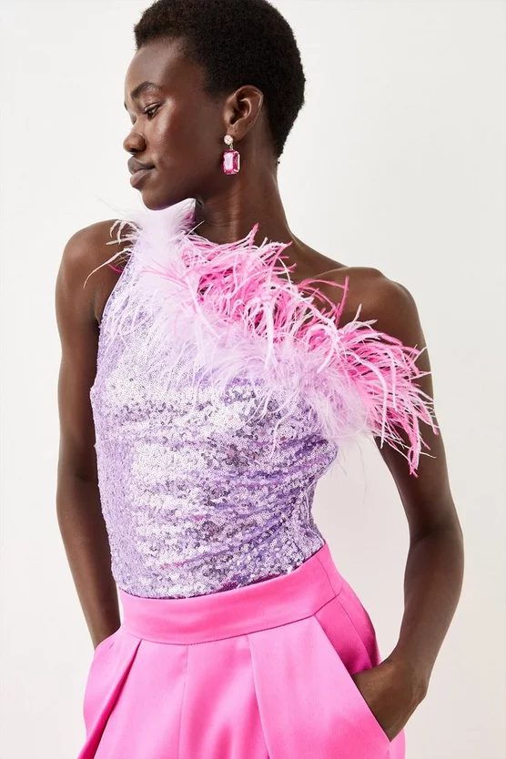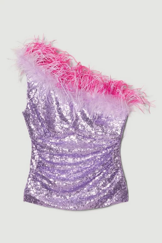 Framed with the ombre depth of a feathered border, this top is a playful foray into party aesthetics. Embellished for an enlivened effect, it has an asymmetric neckline – calling for sleek hair to offset the bold silhouette.