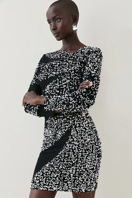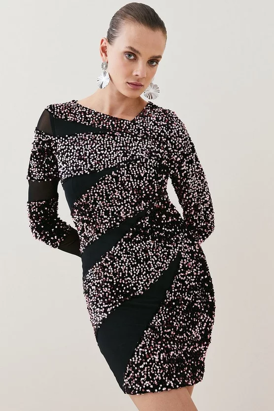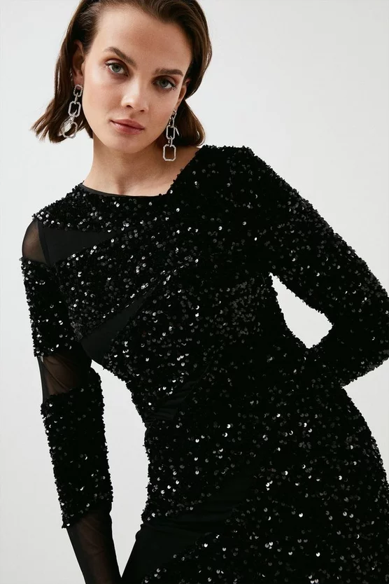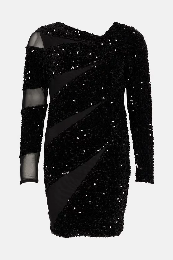 Illuminate the dancefloor with grown-up sequins. This embellished mini dress lets the details do all the talking with a simple, streamlined silhouette. It has an asymmetric neckline, long sleeves and mesh insets to one side. Pair with towering platforms for a conversation-starting ensemble.