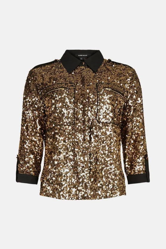 The shirt goes bold for SS22. Resplendent in gleaming gold sequins, this elegantly cut design is perfect for after dark. Plain cuffs and a matching pointed collar counter the all-over embellishments, accentuated further by two sporty zips at the chest. Neat three-quarter sleeves detailed with buttoned trims balance military-style epaulettes for a modern final flourish.
